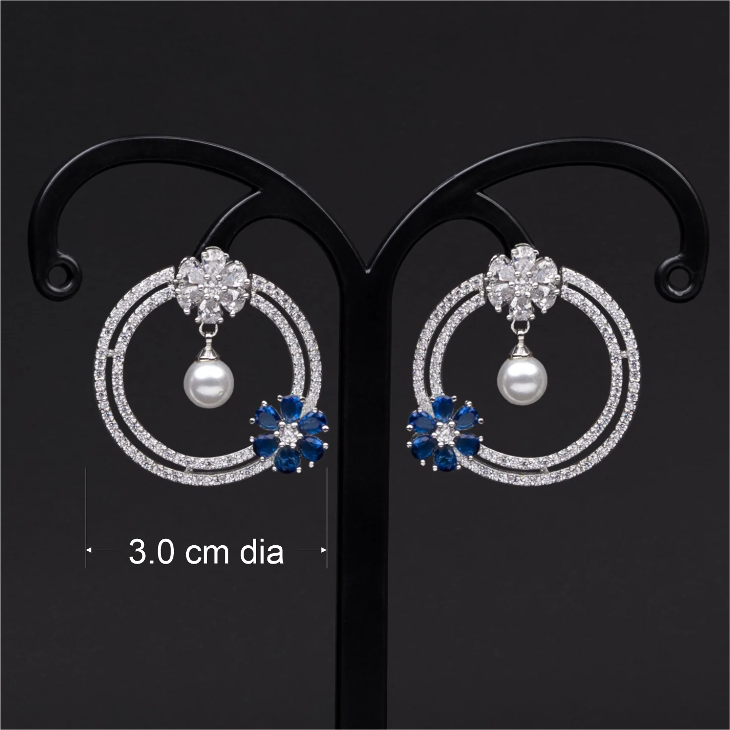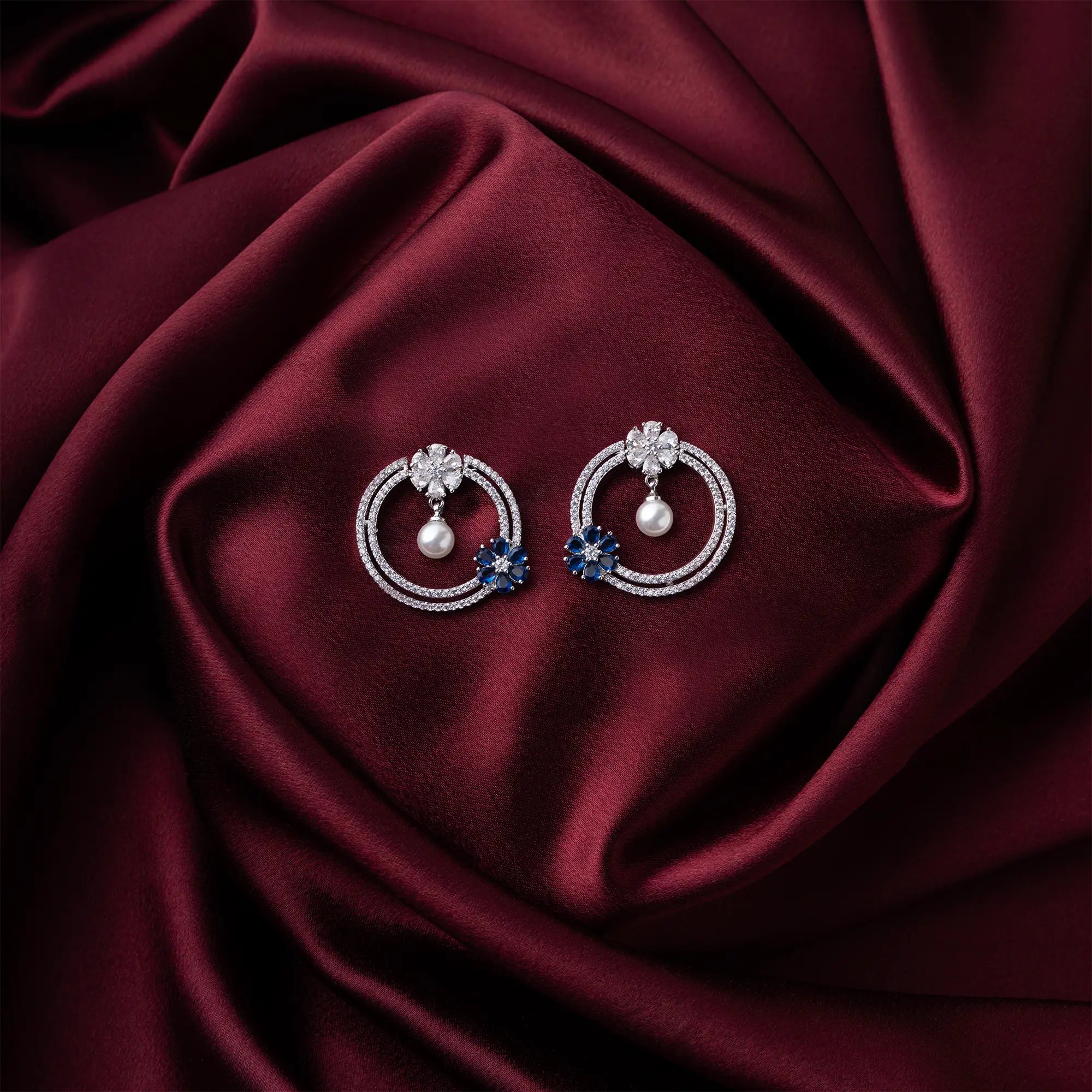 Elevate Your Elegance with our Rhodium Plated earrings adorned with American Diamonds. The Exquisite earrings combine the brilliance of blue stones, white pearls and american diamonds, creating a timeless accessory that effortlessly complements any outfit whether western or traditional.