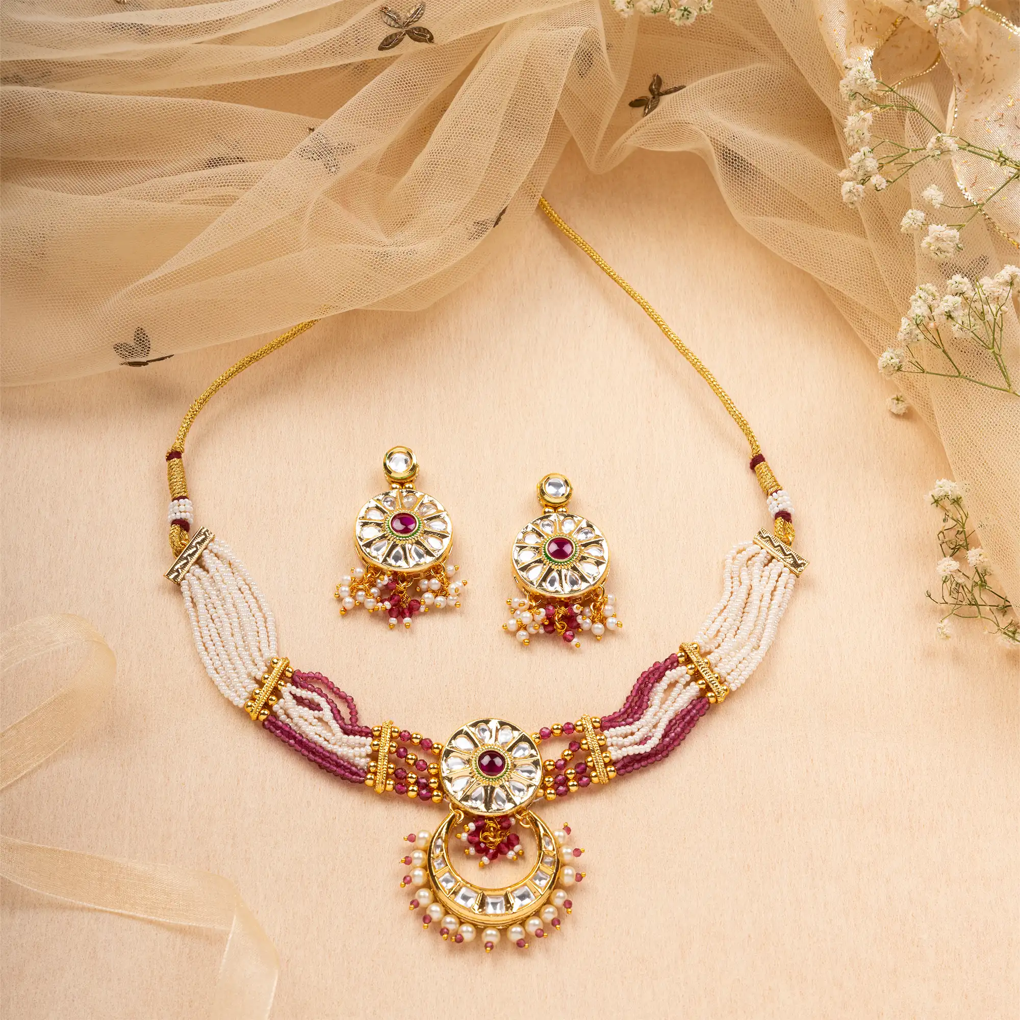Enamor everyone with this necklace and earrings set from MriduMani. Create a buzz around your corner by wearing this jewellery set. You will always be the centre of attraction of any gathering when you don this set. You can team it with any ethnic wear of your choice to look your best.