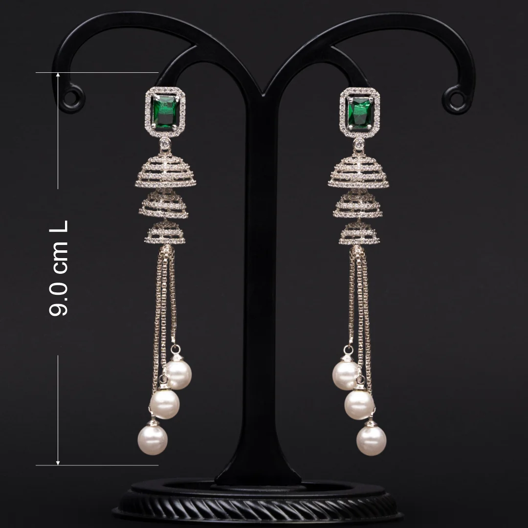 Elevate your elegance with our green contemporary rhodium plated drop earrings adorned with american diamonds and white pearls which can be worn on all kinds of outfits and for all age groups