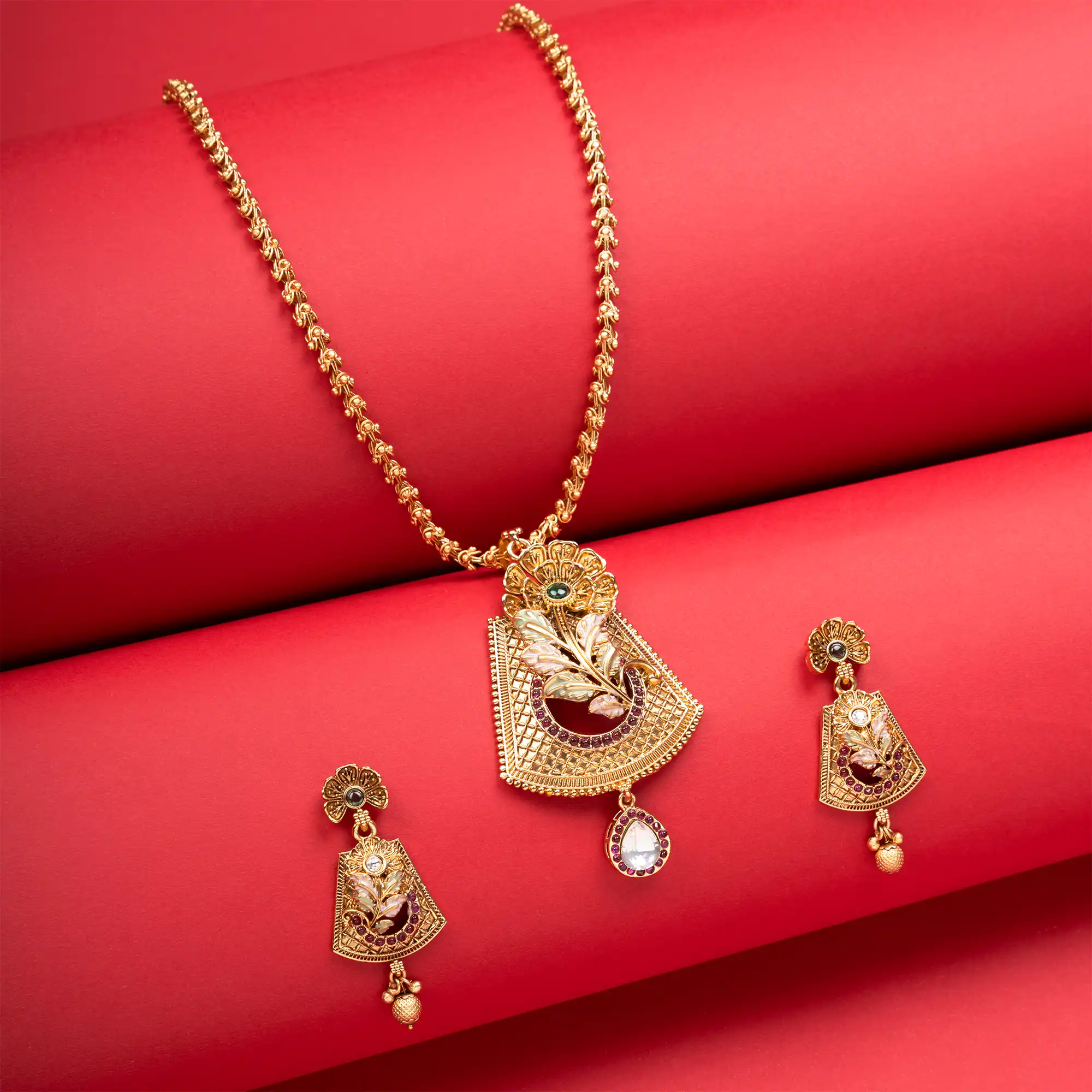 The pendant set from MriduMani is extremely versatile and goes well with every ethnic attire including lehengas, saree and sharara suits. It is a telltale of versatility that knows no bounds because of how it can be styled with almost any kind of outfit.