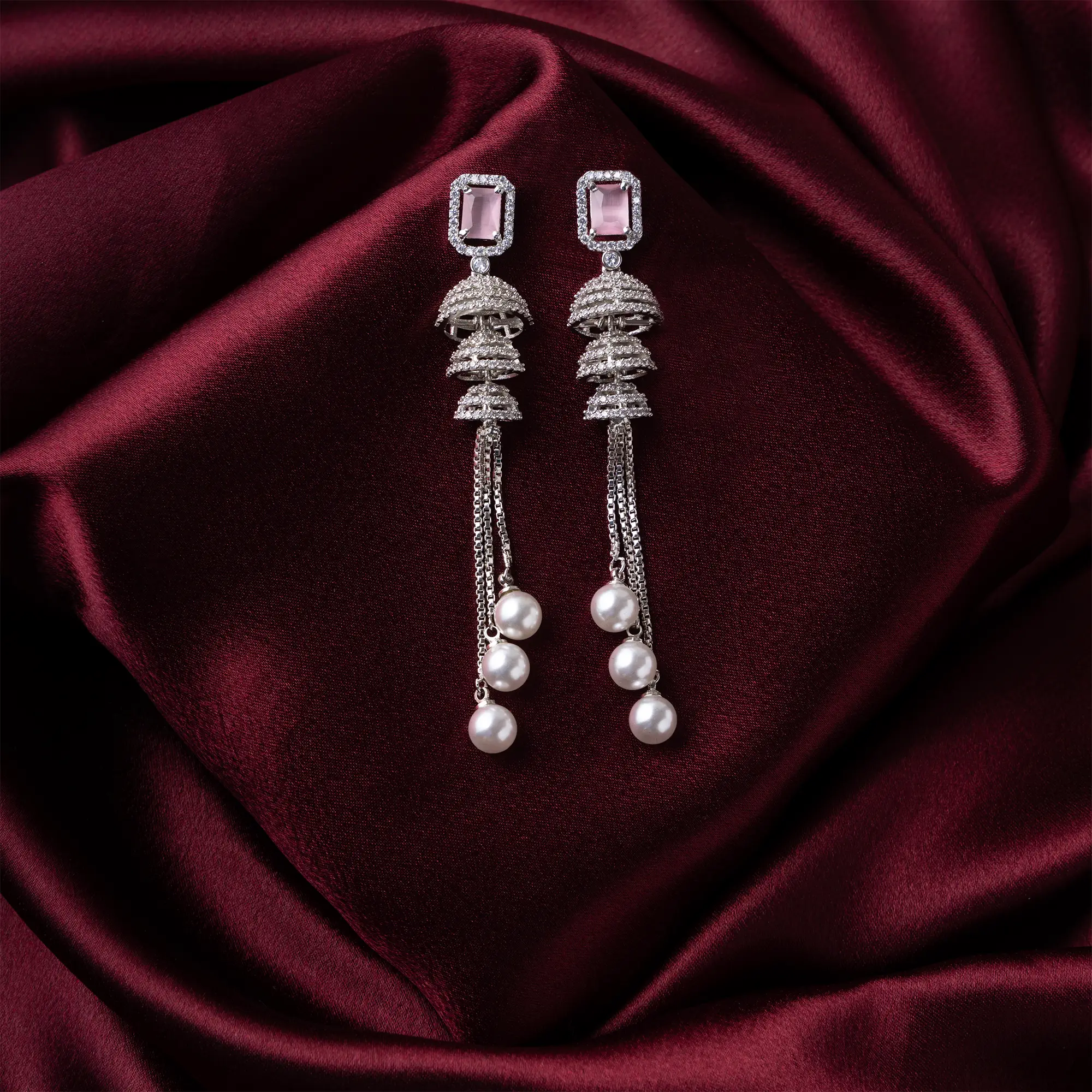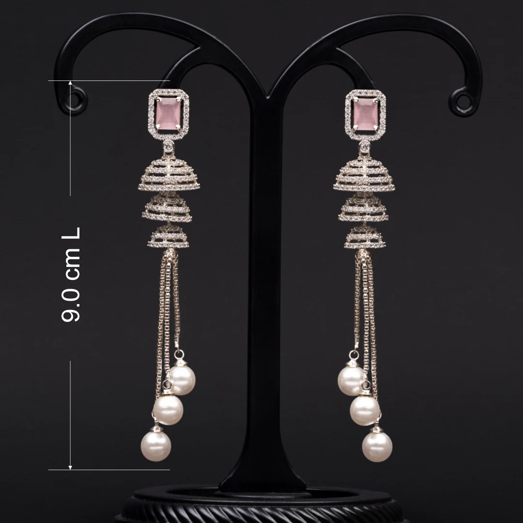Elevate your elegance with our pink contemporary rhodium plated drop earrings adorned with american diamonds and white pearls which can be worn on all kinds of outfits and for all age groups