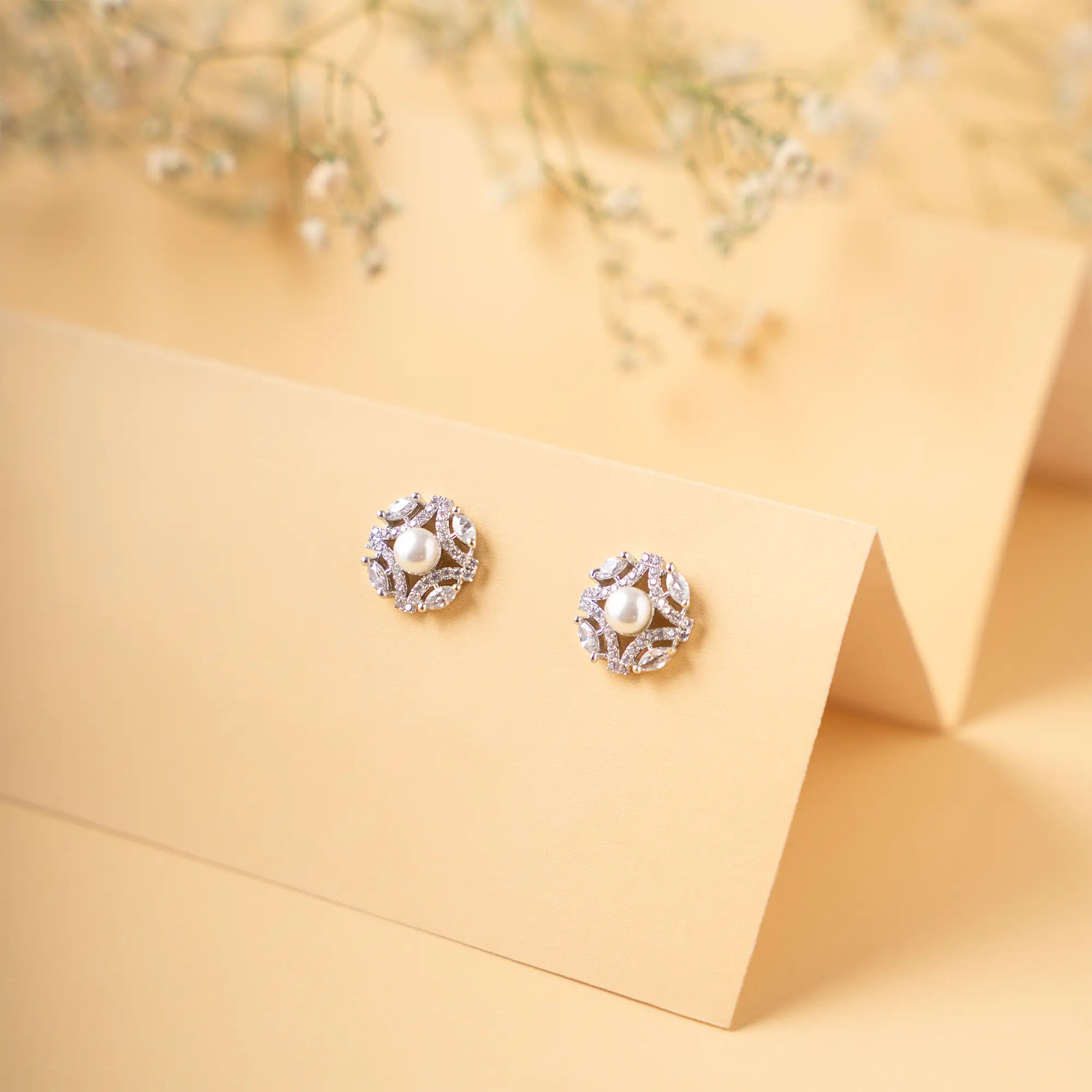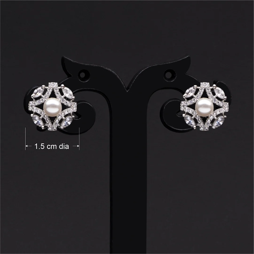 Elevate your elegance with our rhodium plated studs adorned with american diamonds. The exquisite earrings combine the brilliance of american diamonds and pearl, creating a timeless accessory that effortlessly complements any outfit.