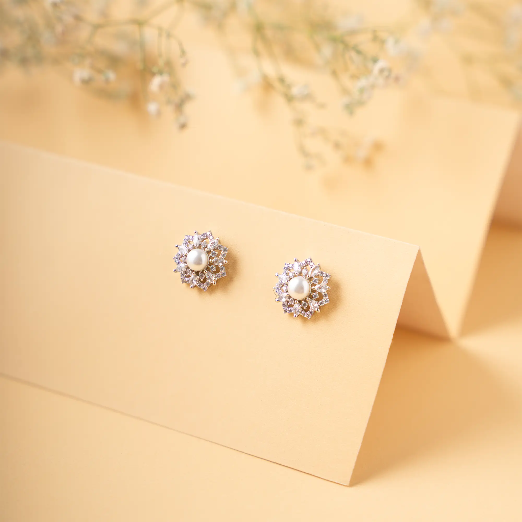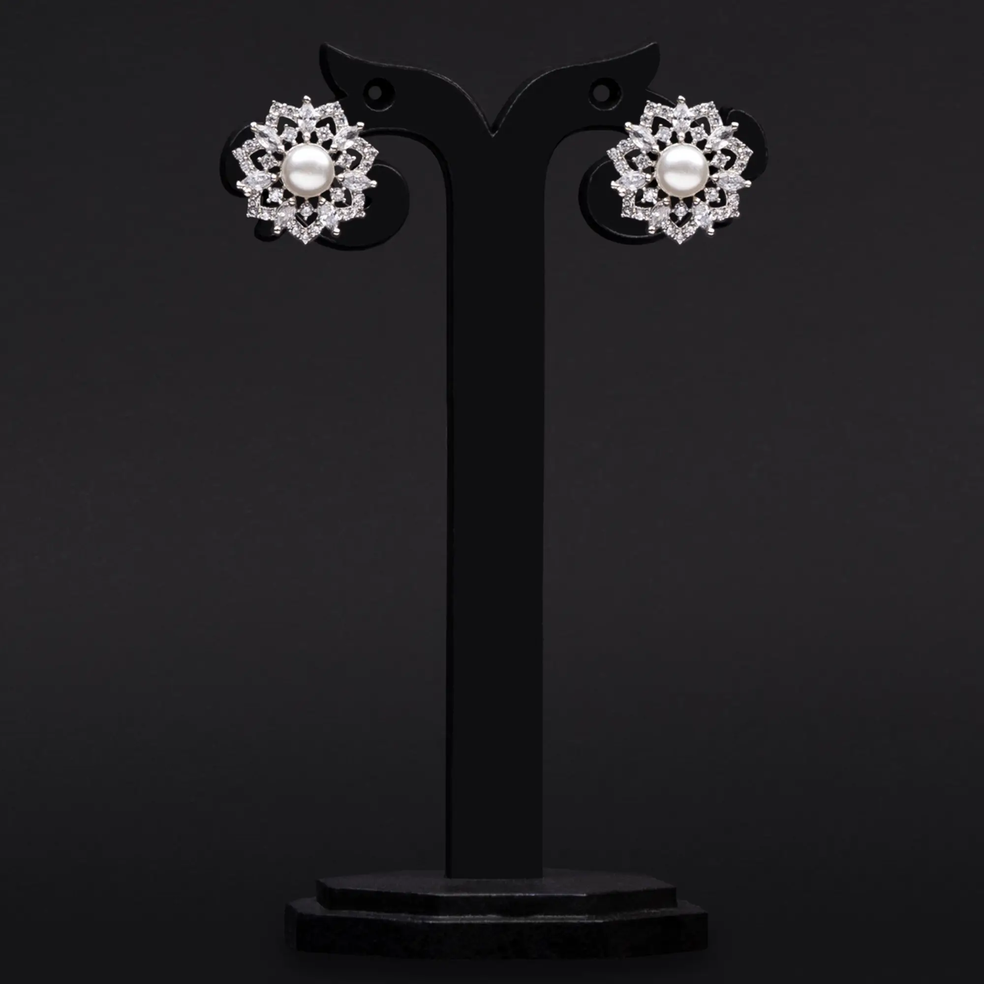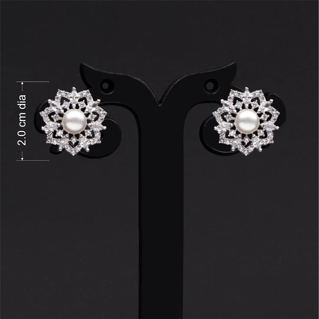 Elevate your elegance with our rhodium-plated earrings adorned with american diamonds. The exquisite earrings combine the brilliance of pearl with american diamonds, creating a timeless accessory that effortlessly complements any outfit.
