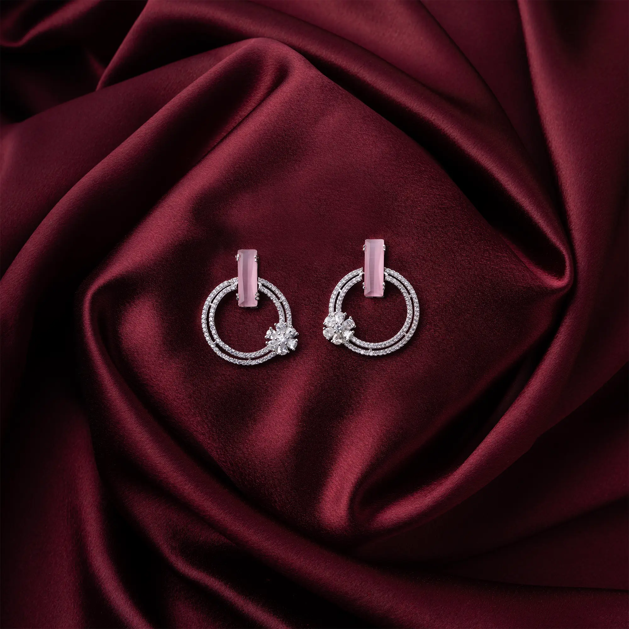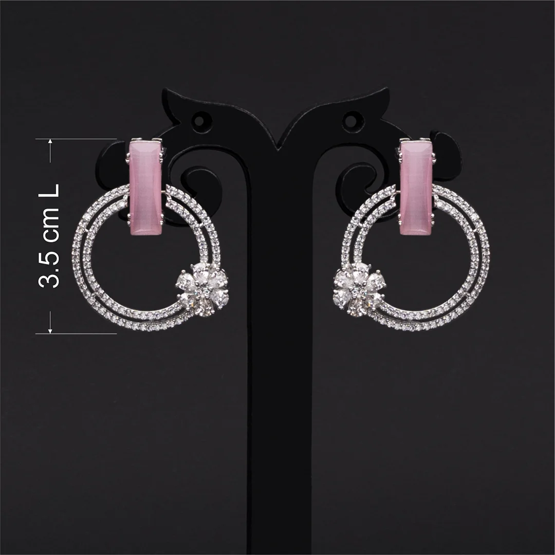 Elevate your elegance with our rhodium plated earrings adorned with american diamonds and a blush pink stone. The exquisite earrings combine the brilliance of pink stone and american diamonds, creating a timeless accessory that effortlessly complements any outfit.