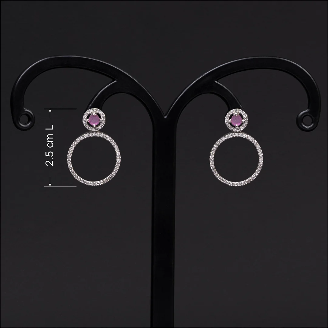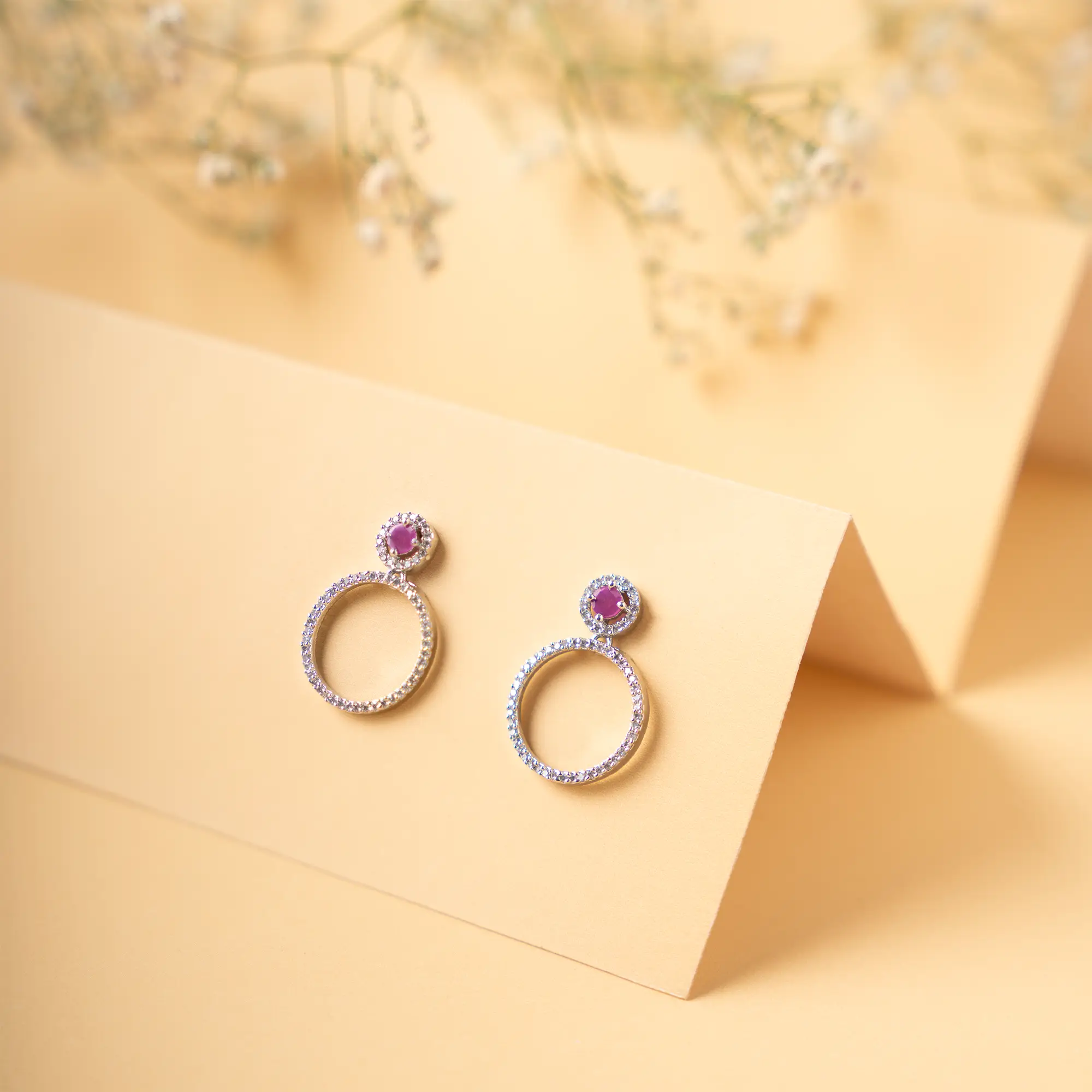 Elevate your elegance with our rhodium plated studs adorned with american diamonds. The exquisite earrings combine the brilliance of american diamonds and pink stone, creating a timeless accessory that effortlessly complements any outfit.