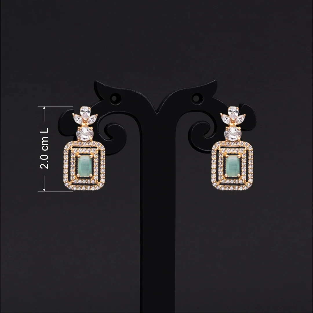 Elevate your elegance with our rose gold-plated earrings adorned with american diamonds. The exquisite earrings combine the brilliance of american diamonds, white and mint stones, creating a timeless accessory that effortlessly complements any outfit.