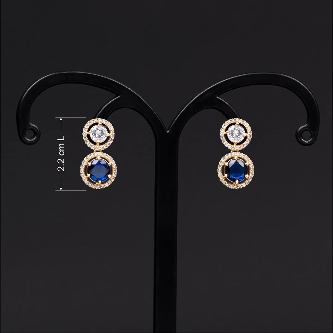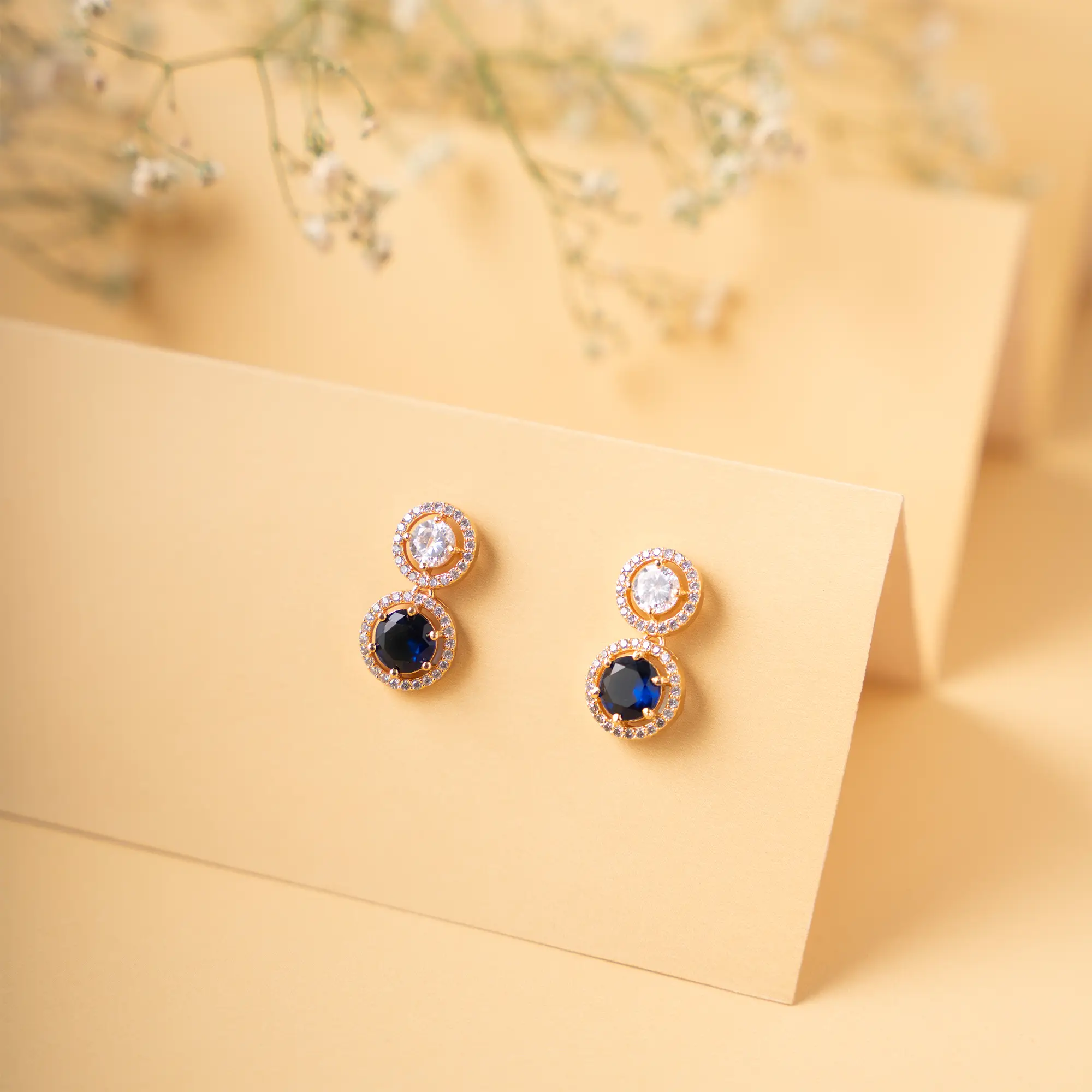 Elevate your elegance with our rose gold-plated earrings adorned with american diamonds. The exquisite earrings combine the brilliance of white and blue stones with american diamonds, creating a timeless accessory that effortlessly complements any outfit.