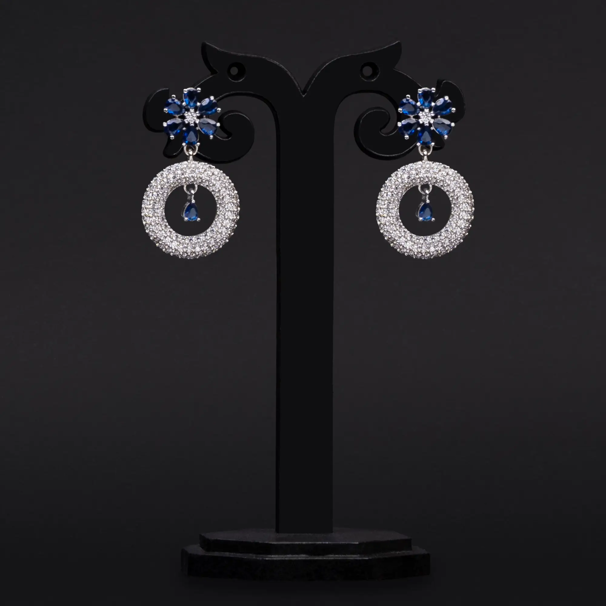 Elevate your elegance with our rhodium plated earrings adorned with american diamonds and royal blue stones foral motif. The exquisite earrings combine the brilliance of blue stones and american diamonds, creating a timeless accessory that effortlessly complements any outfit.