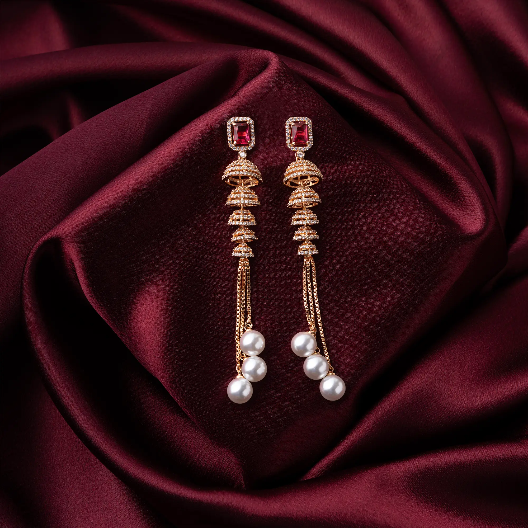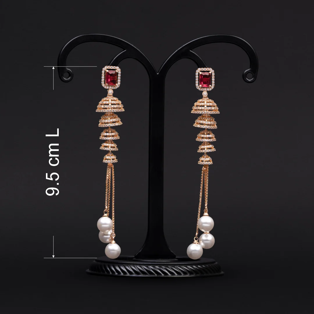 Elevate your elegance with our rose gold plated danglers adorned with a big ruby red stone top, american diamonds and big white pearls. The Exquisite earrings combine the brilliance of red stones, white pearls and american diamonds, creating a timeless accessory that effortlessly complements any outfit whether western or traditional.