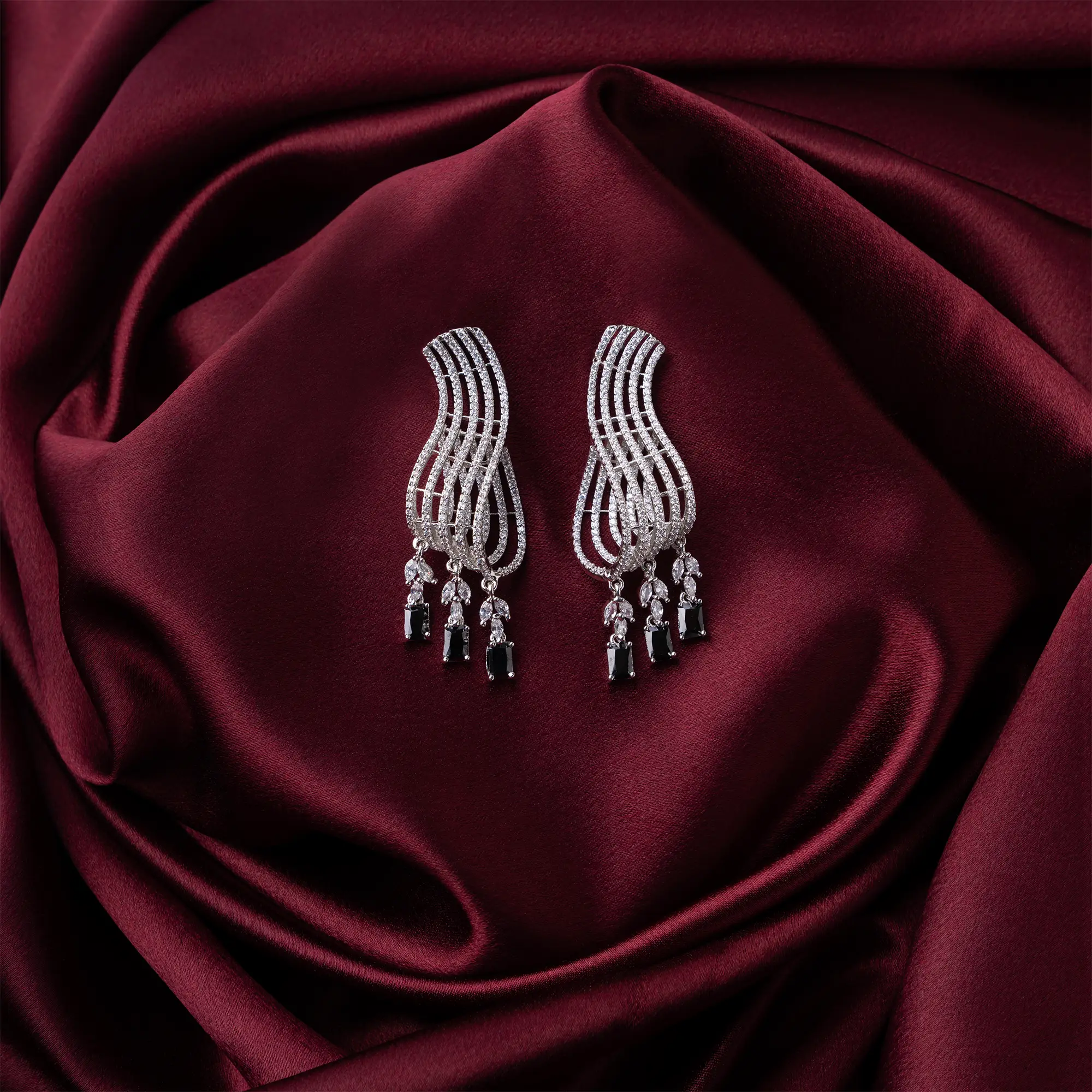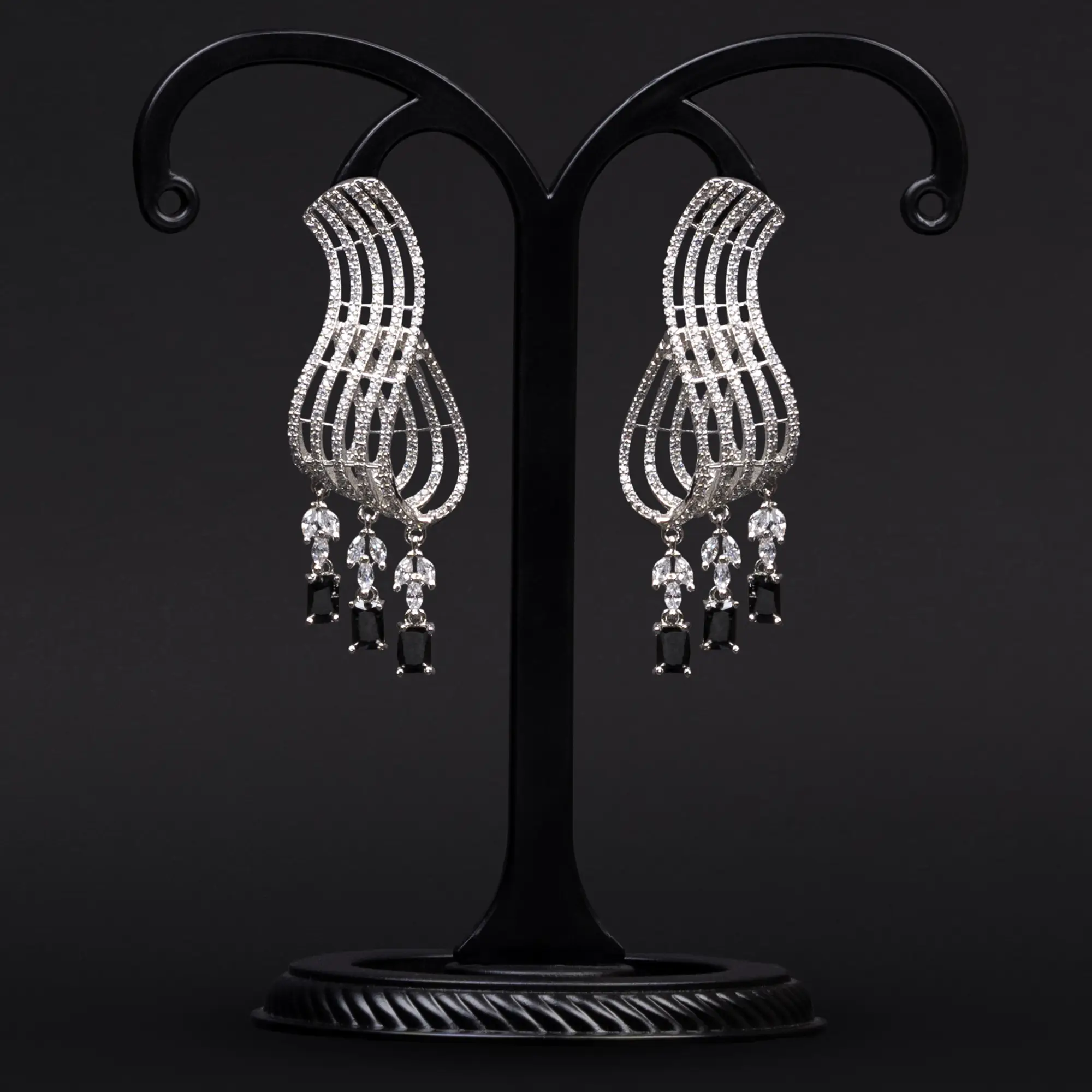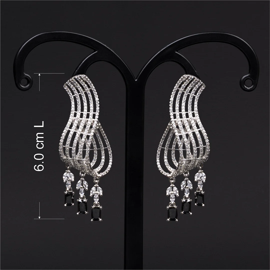 Elevate your elegance with our rhodium plated danglers adorned with american diamonds. The exquisite earrings combine the brilliance of black stones and american diamonds, creating a timeless accessory that effortlessly complements any outfit whether western or traditional.