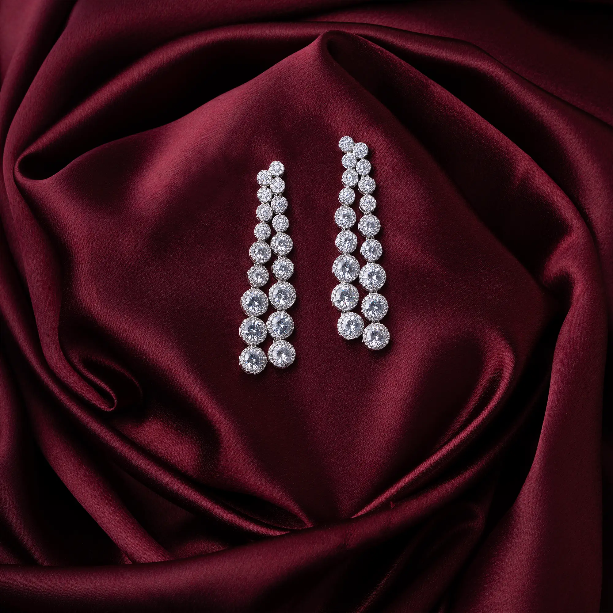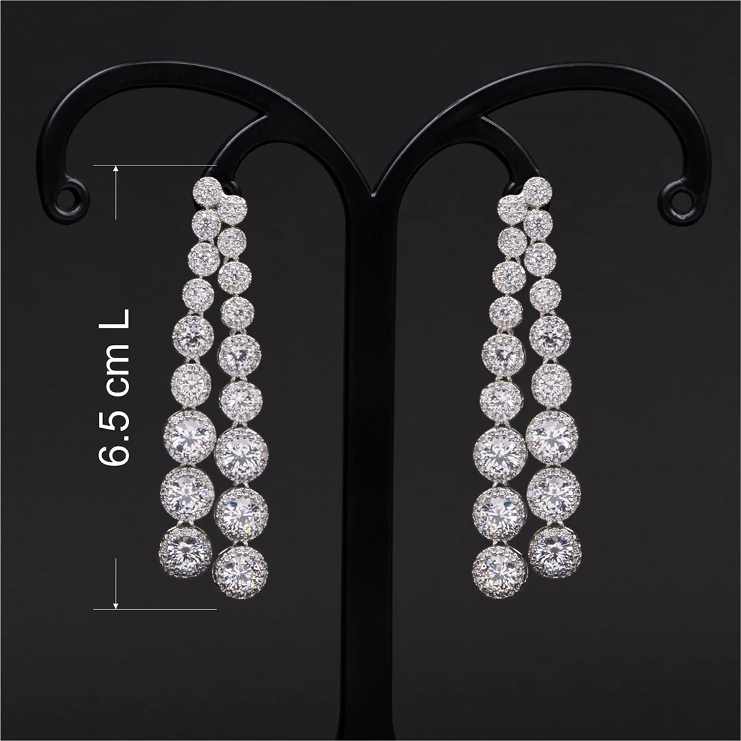 Elevate your elegance with our contemporary rhodium plated danglers adorned with american diamonds and solitaires which can be worn on all kinds of outfits and for all age groups.