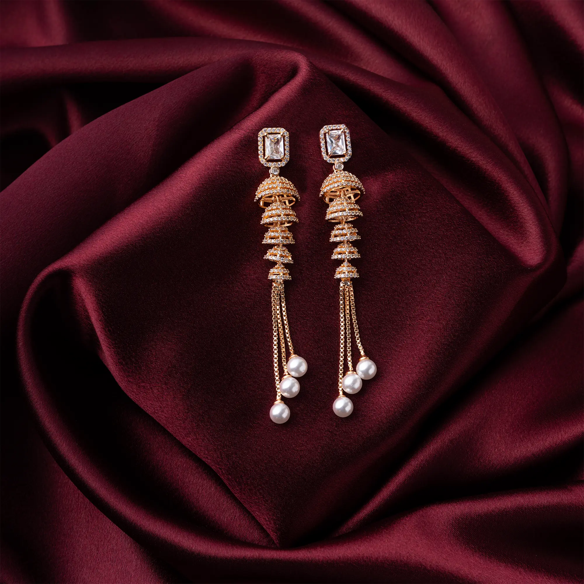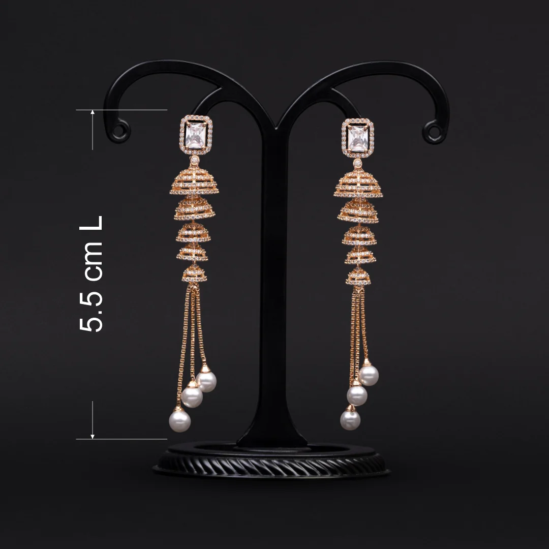 Elevate your elegance with our rose gold plated danglers adorned with a big white stone top, american diamonds and big white pearls. The Exquisite earrings combine the brilliance of white stones, white pearls and american diamonds/zirconia stones, creating a timeless accessory that effortlessly complements any outfit whether western or traditional.